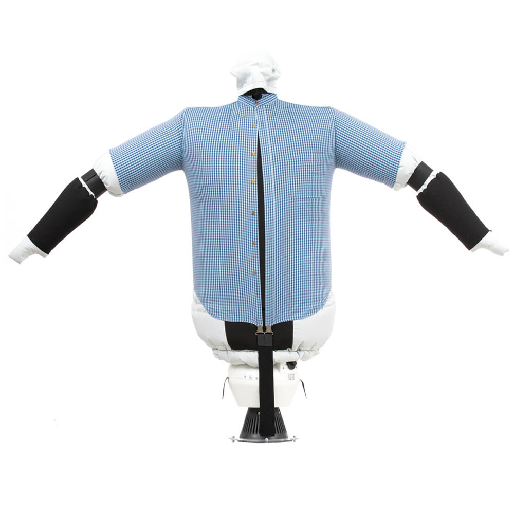 Способ применения: Одежда обязательно влажная (например, после отжима > 800 - 1400rpm в стиральной машине) встряхиваются и аккуратно размещаются на «Кукле-форме». Для рубашки: после расправления складок и надежной фиксации изделия на гладильном манекене и регулировки ширины плеч, необходимо включить манекен, чтобы наполнить куклу потоком холодного воздуха. Затем окончательно расправить гладимое изделие в натянутом виде, поправить, если требуется растяжки – убрать морщины на ткани. Затем включить нагрев. Теперь ваша одежда будет гладиться, и сушиться в автоматическом режиме. Мощный поток горячего воздуха позволяет высушить ткань, пока одежда наполнена воздухом и хорошо растянута, и одновременно отгладить ее без морщин и складок. Через некоторое время, 6-8 минут для рубашек и 10-11 минут для брюк - одежду можно аккуратно снимать. После глажения одежды можно надеть ее или убрать на хранение в шкаф.