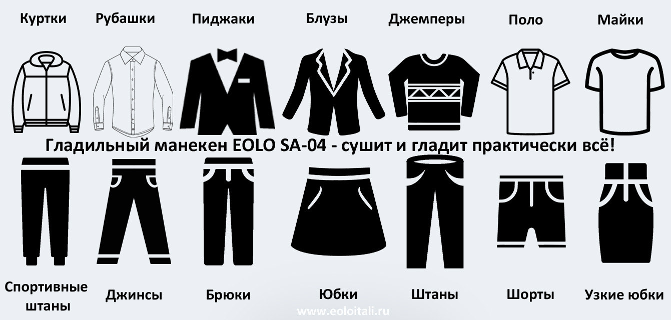 Гладильный манекен SA-04 имеет возможность гладить и рубашки и штаны, в комплекте 2 чехла для глажения Курток, пиджаков, рубашек, блуз, маек поло, юбок, штанов или джинс. Плечи и толщина кукол регулируется позволяя гладить одежду практически любых размеров. SA-04 не имеет собственной подставки или колес и предназначен для работы на любой ровной поверхности удобной по высоте для пользователя.